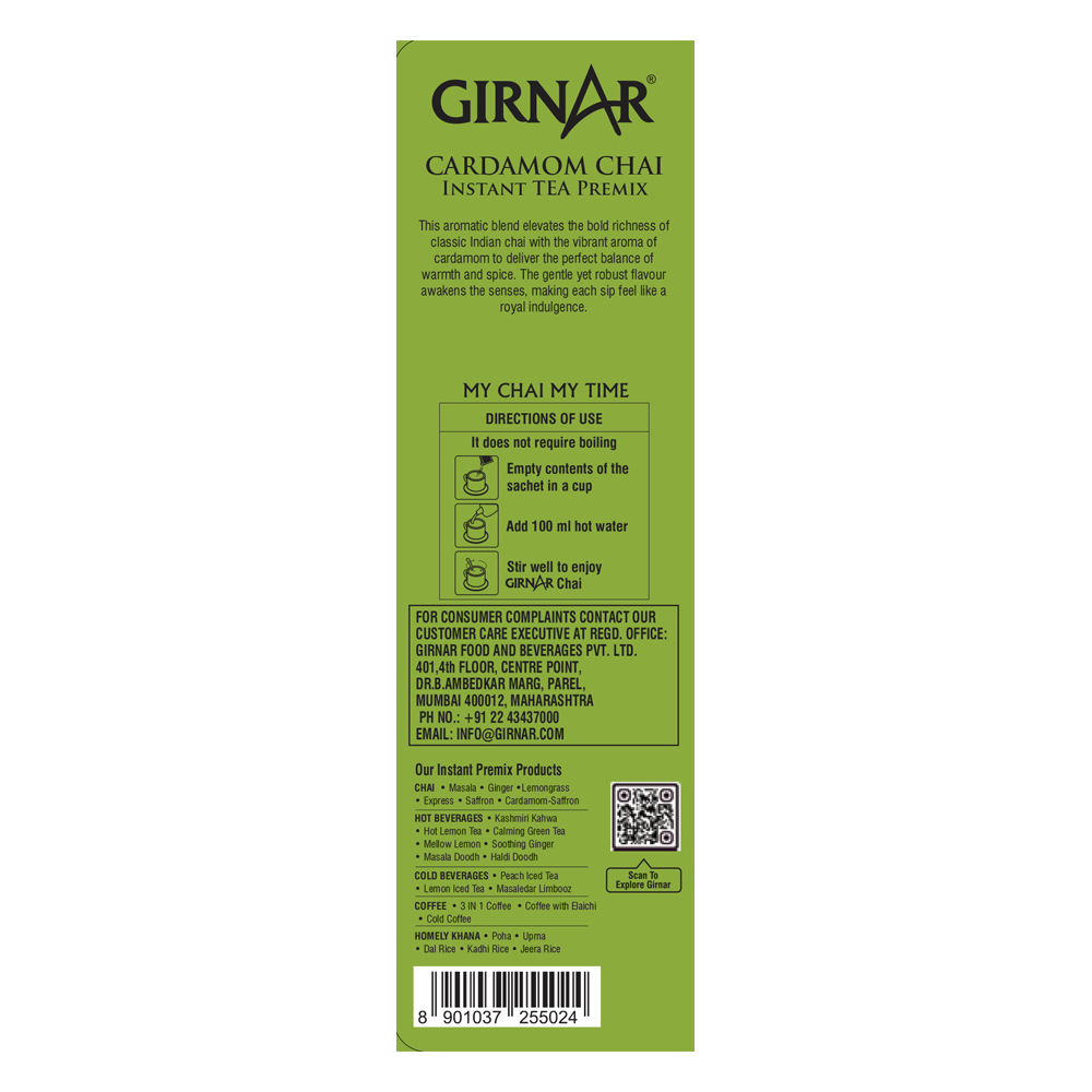 A Premix of Strong chai with a delicate but refreshing Cardamom flavour, Girnar’s Cardamom (Elachi) Chai is a royal blend that appeases your nose buds and your taste buds.